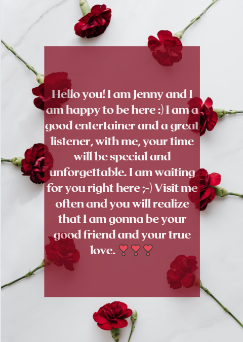 Você pode PEDIR UM ENCONTRO com JennyBanks quando for conveniente para você. Tudo está no seu fuso horário, suas horas locais. Ela receberá seu pedido e o aceitará se sua agenda estiver livre. Você receberá uma confirmação por e-mail e poderá se preparar para sua experiência quente.